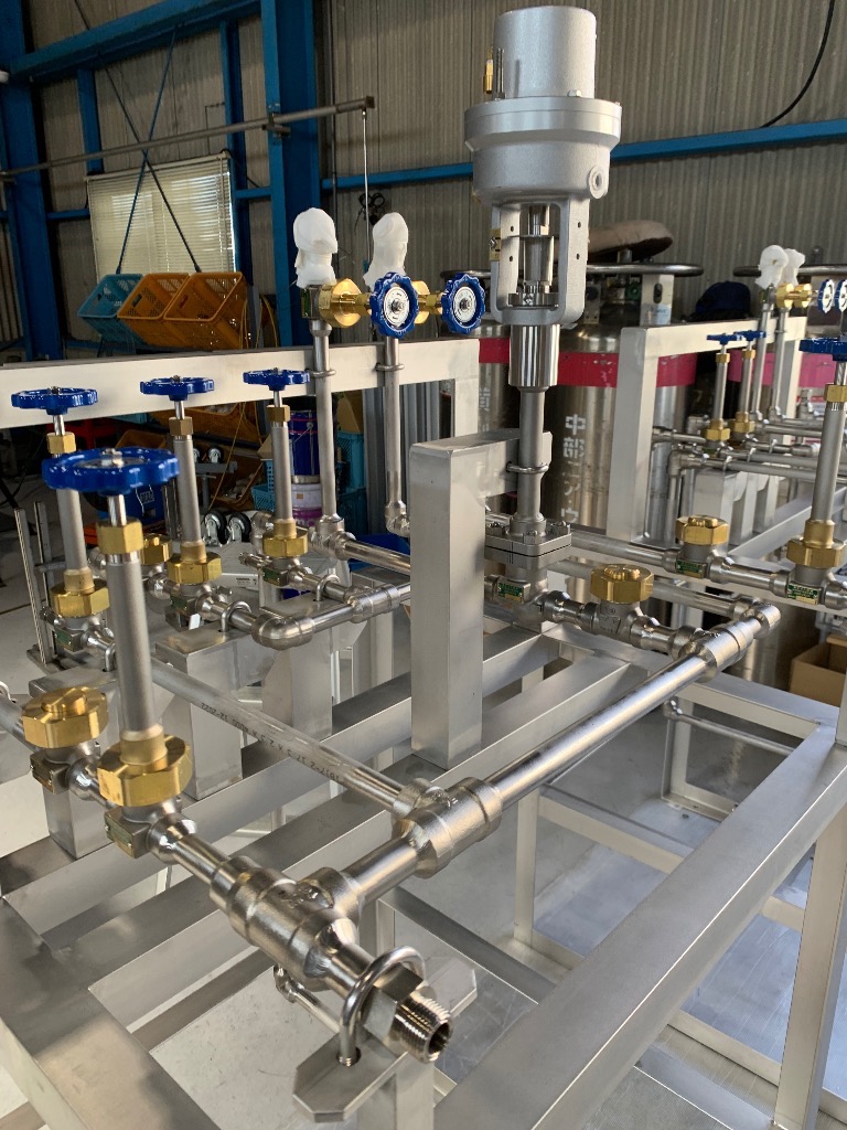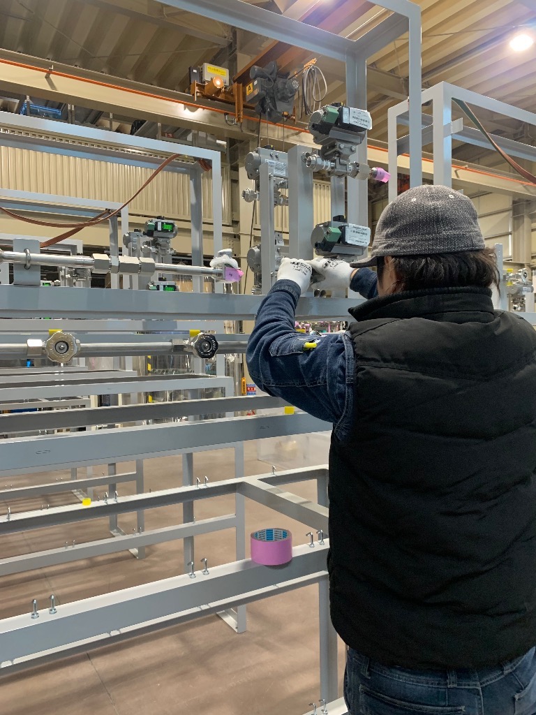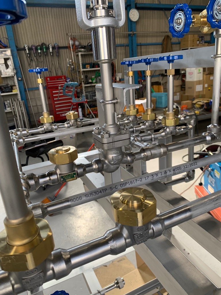 架台に装置を取り付けて配管の寸法取りを行っています。